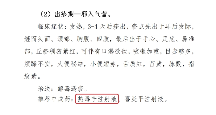 其中,,,,,《麻疹诊疗计划(2024版)》中先容,,,,,麻疹以外透为顺,,,,,内传为逆。。。。。。。。麻为阳毒,,,,,以透为顺,,,,,以清为要,,,,,故清热透疹为基本治则。。。。。。。。其中“顺证”诊疗分为前期、出疹期和恢复期三个极端,,,,,在病情生长到“出疹期”时,,,,,计划推荐使用热毒宁注射液。。。。。。。。
