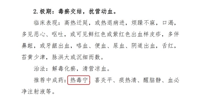 另一份《登革热诊疗计划(2024版)》中也详细先容了怎样运用中医中药的诊疗要领来搪塞登革热疾病,,,,,其中在病情“发热期”和“极期”,,,,,计划都推荐使用热毒宁注射液来控制和治疗病证。。。。。。。。